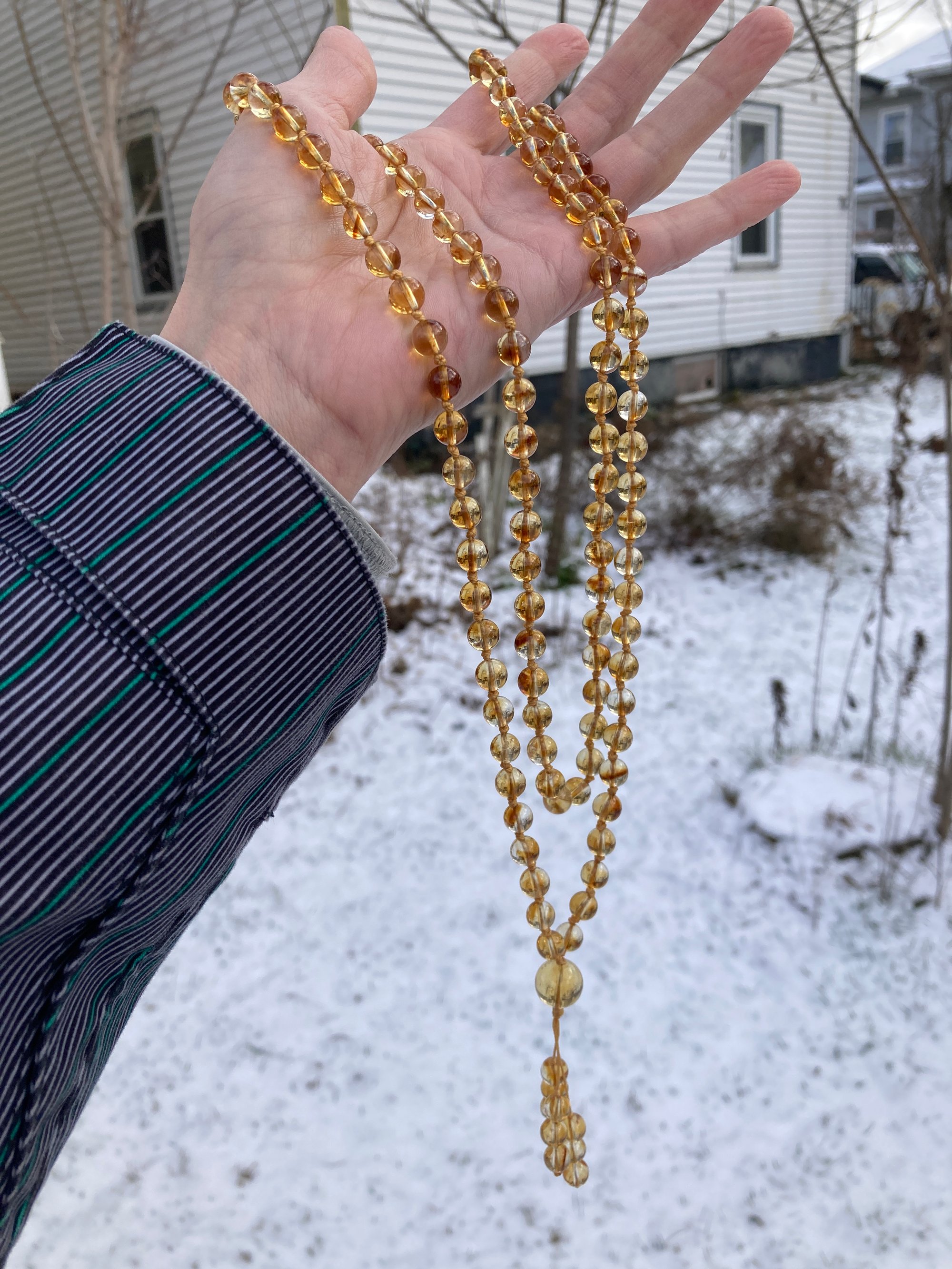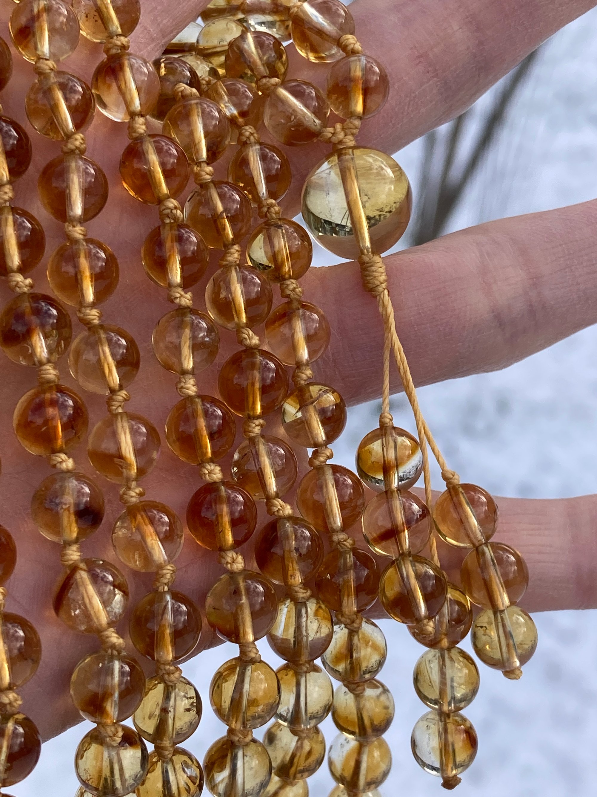 Genuine 7.5mm-8mm citrine adorns this lovely 108 bead hand knotted gemstone mala. There is a 13mm genuine citrine bead representing the guru bead. This mala has been lovingly hand knotted on nylon cord and finished with a variation of The Mala The Mission's signature three bead tassel. This is the exact mala you will receive. This citrine is heat treated. I have greatly reduced the price due to the appearance of darker zoning. The heat treatment is common practice for much of the citrine on the market and doesn't affect the healing properties of the gemstone.